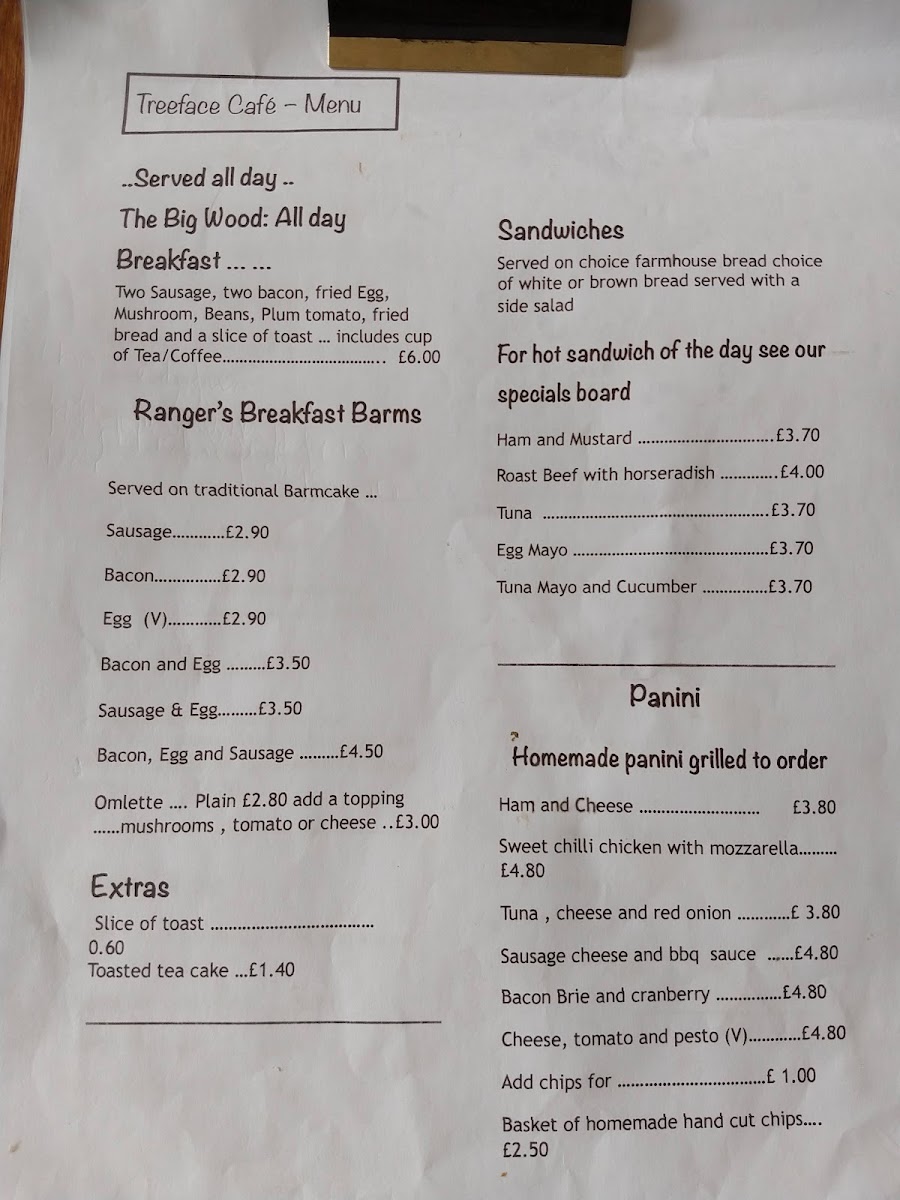 The menu at Treeface Cafe in Chorley PR7 3RN offers a variety of options suitable for breakfast, light meals, and casual dining. The selection includes several types of sandwiches and paninis, such as bacon, brie and cranberry, providing convenient choices for a quick meal. For breakfast and light bites, items on toast are available with toppings like spaghetti hoops, beans, or fried and scrambled eggs. The menu also features a range of extras including toasted tea cakes and scones, as well as quiches and breakfast omelettes for more substantial options.